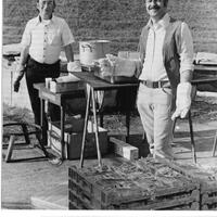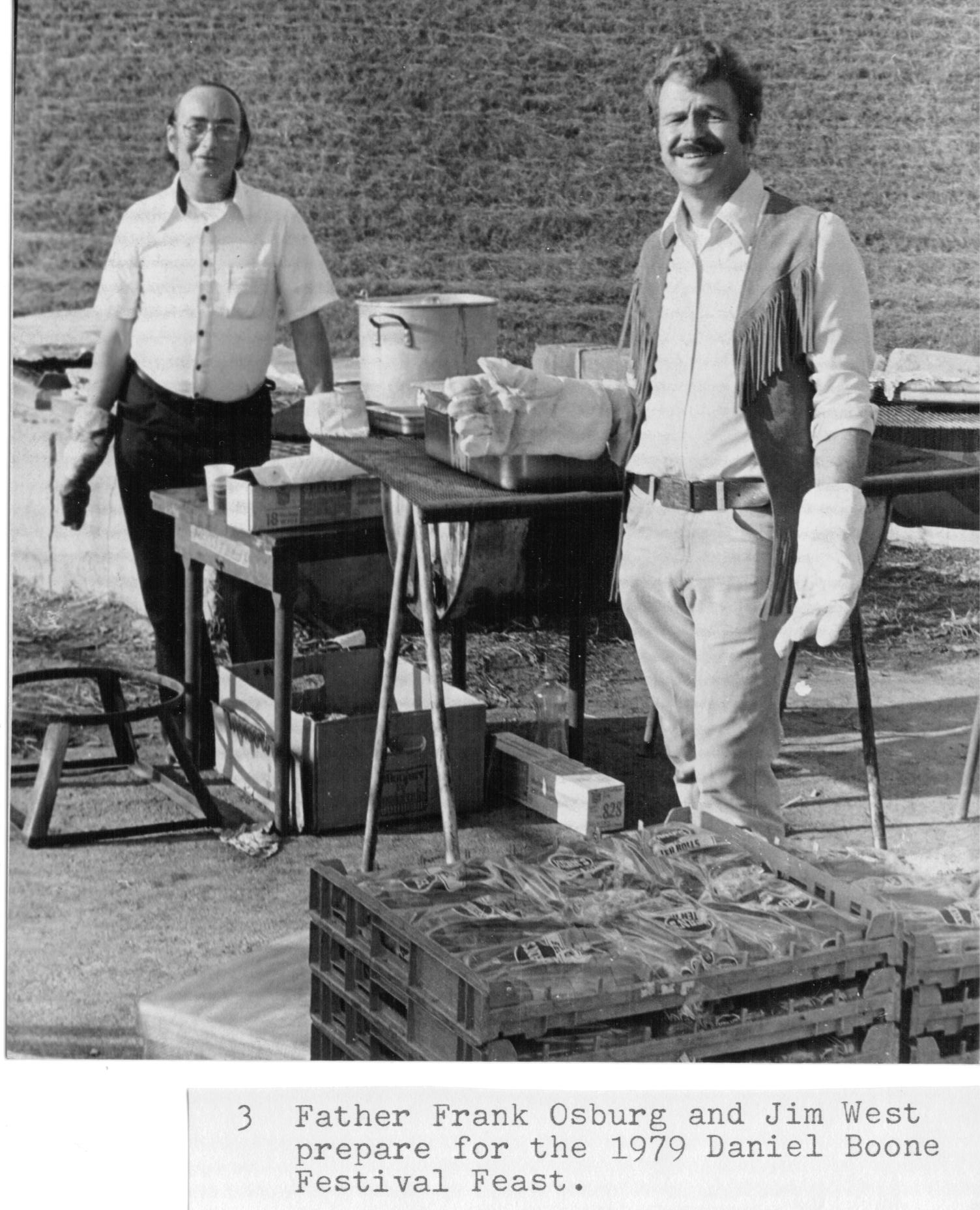 Father Frank Osburg and Jim West prepare for the 1979 Daniel Boone Festival Feast.